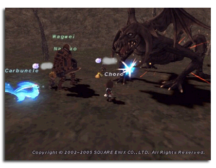 いきなりPTに誘ってもらえて、その後Eさんのお友達も加わりすぐに3人PTとなった。狩人・召喚士・モンク(←チョロ)の3人。よくみたら仲間の二人はBibbyフェイスとConronフェイス・・・波乱の予感を感じながら列が進むのを待った。