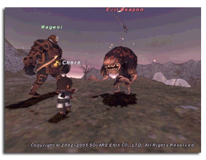 そして明け方早速フェロー(NPC)ワグエ君呼び出し!ジャジャン!お〜〜ハゲてるぅ〜!装備はグラフィックでしか判断できないけどこれはスケイル装備かな?チョロはモンクでバタリアの楽ウエポンを狩って一緒に遊んでみた。NPCはチョロが抜刀するといきなり挑発。WSも撃つしヒーリングも一緒にするし、ホント相棒という感じである