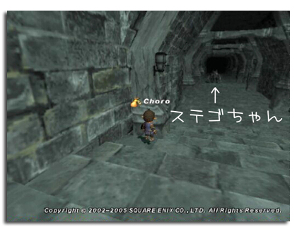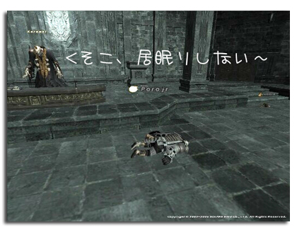 Porojrがずんずん進むと、無反応。なんだ〜通れるじゃん〜!チョロも後を追って進んでいった。この頃にはPT内各自好き勝手に探索していたのでGyabanとはもう2度と会えないくらい離れてしまっていた。そしてこの通路の先にあるドアを開けてみると・・・・