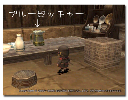 これをどこから手に入れたのかというと、家具=邪魔としか思ってないChappie(またか!)である。これも「山師の地図」でドロップするのだ。かなり初期にこのブルーピッチャーを釣り上げていたChappieは、初物ということで少し値を張って競売に出していたらしい。そして競売から返却されること数回。あまりの売れなさすぎにキレたChappieが
